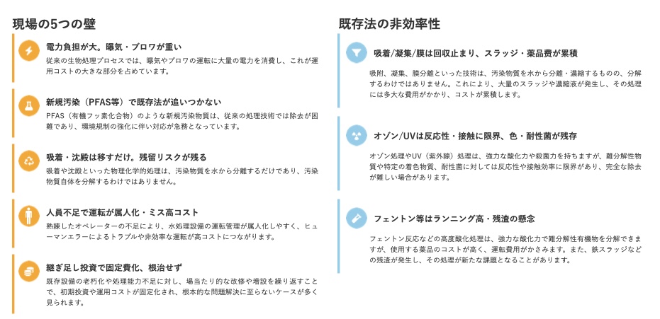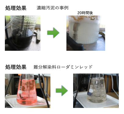 すべての汚染物質を完全に分解するわけではありませんが、既存の処理法と比較して大幅な低減を実現します。残存する物質は、生物処理などの後段プロセスで仕上げることが可能です。